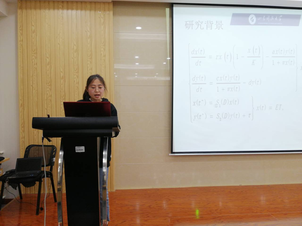 12月15日晚,数聚西海岸科学讲堂——研究生讲坛第126期在J9-433成功举办。网投十大信誉可靠平台2019级应用数学硕士候晓雨作了题为“具有农药剂量作用和状态反馈控制的Holling II捕食-食饵模型”的报告。本次讲坛邀请的点评嘉宾是网投十大信誉可靠平台程惠东老师。学院40余名研究生参加了此次讲坛,本次讲坛由科技部宋立凤主持。