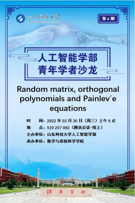 摘要:Random matrix theory is important in statistics, wireless communication, finance and so on. Painlev´e transcendents are nowadays widely recognized as important special functions with a broad range of applications including integrable models, combinatorics and random matrix theory. The study of random matrix theory (RMT) and orthogonal polynomials (OPs) for varying weights is often related to Painlev´e equations. For example, the properties of Hankel determinants which are always playing the most fundamental role in RMT, as well as the asymptotic behavior of the recurrence coefficients with respect to OPs, can be found by the analysis of the associated particular Painlev´e equations. The analysis of Hankel matrices occurs naturally in moment problems, which plays an important role in random matrix theory. The smallest eigenvalue is important since it gives great useful information on the nature of Hankel matrices with respect to given weights. Painlev´e equations possess many similar interesting properties as integrable systems such as Lax pairs for which they act as compatibility conditions. The solutions of Painlev´e equations have special transformations (called Backlund transformations) which form interesting affine weyl groups.