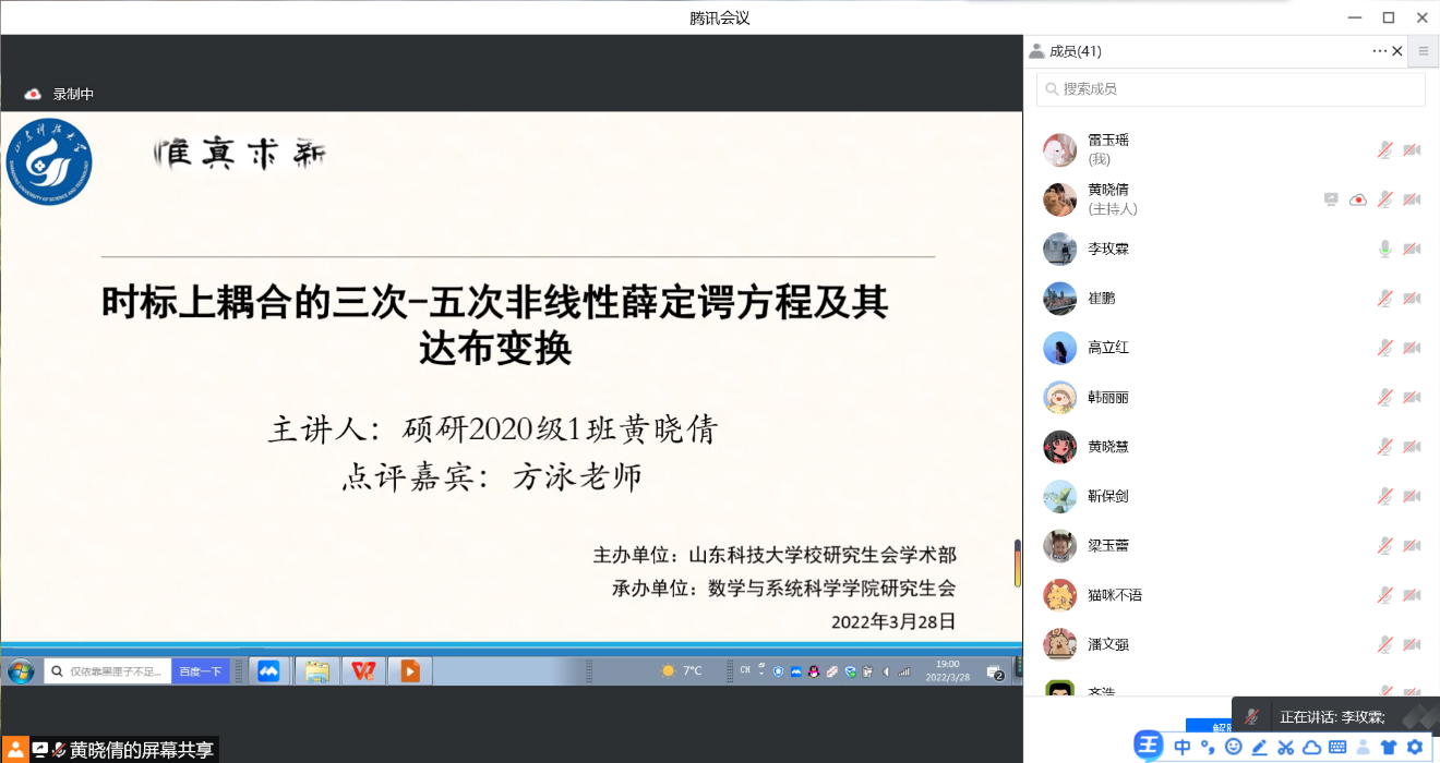 3月28日晚,数聚西海岸科学讲堂——研究生讲坛第173期在腾讯会议673-856-004成功举行。网投十大信誉可靠平台2020级数学专业硕士黄晓倩作了题为“时标上耦合的三次—五次非线性薛定谔方程及其达布变换”的报告。本次点评嘉宾是网投十大信誉可靠平台方泳教授。讲坛由科技部李玫霖主持。