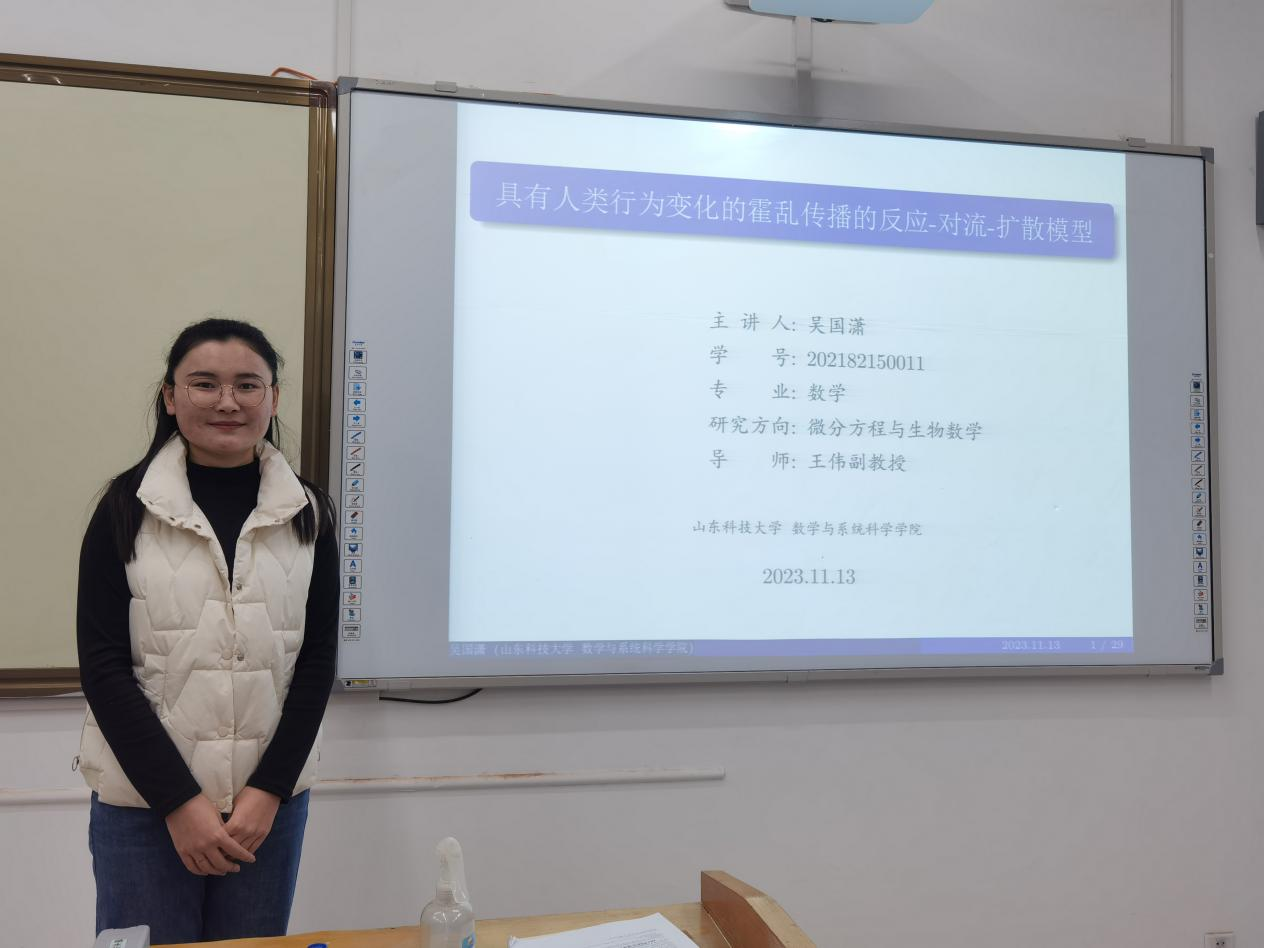 11月13日晚,数聚西海岸科学讲堂——研究生讲坛第204期在J5-304成功举行。网投十大信誉可靠平台2021级2班吴国潇作了题为《具有人类行为变化的霍乱传播的反应-对流-扩散模型》的报告。本次点评嘉宾是网投十大信誉可靠平台王伟副教授。学院20余名本科生和研究生参加了此次讲坛,本次讲坛由科技部宋晓晶主持。