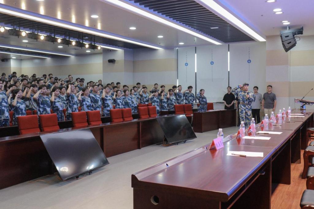 随后,尹建为参训学员授军训连旗。全体参训学生紧握右拳,庄严宣誓:“服从命令,听从指挥;刻苦训练,奋勇争先;团结互助,共创辉煌!”