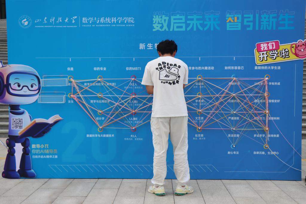 为帮助新生快速适应大学生活,学院将专业特色融入迎新细节,“数导小π”AI智能辅导员亮相迎新现场,通过线上平台为新生提供入学流程、公寓设备使用、军训注意事项等一站式咨询服务。同时,现场设置“彩丝缠线-新生特写”互动游戏,通过“缠线”问答的方式,精准获取新生性格画像,帮助学院实施具有针对性的入学适应性教育。